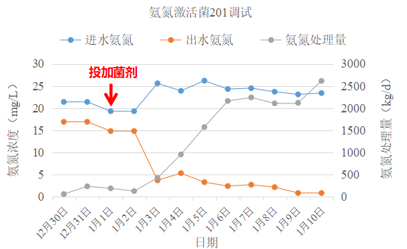 庫巴魯®氨氮激活菌201投加3日后出水氨氮開始降低,系統硝化能力明顯好轉