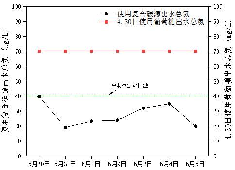 處理后效果:采用我司復合碳源+總氮菌+生物強化技術調試效果顯著,3天時間總氮穩定在40mg/L以下。
